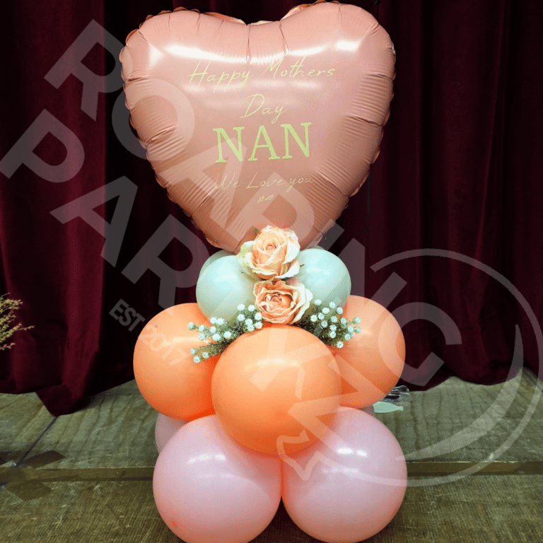 Celebrate Mother’s Day in style with our Personalised Floral Balloon Tower 2026 —the perfect gift to make her feel truly special. This stunning arrangement features a soft peach and pink balloon base, creating a warm and elegant foundation. Adorning the base are delicate, matching soft florals, adding a touch of natural beauty to the display. Above, a personalised pink heart-shaped balloon takes centre stage, offering a personal touch that will make her smile. This beautiful tower is a thoughtful and unique way to express your love and appreciation this Mother’s Day.